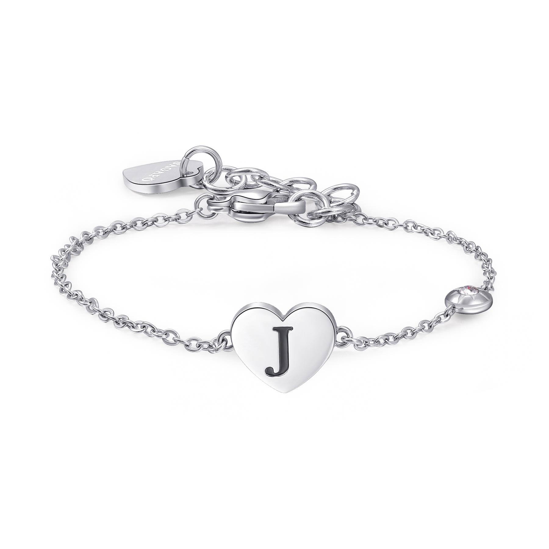 Bracciale in acciaio 316L con lettera J, smalto nero e cristallo.