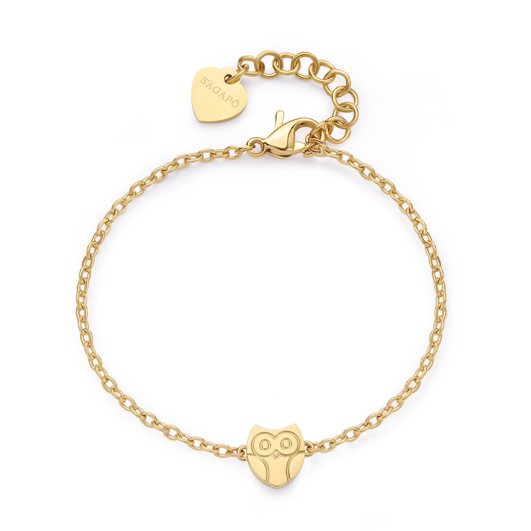 Bracciale in acciaio 316L e finitura pvd oro 14K con pendente a forma di gufetto.