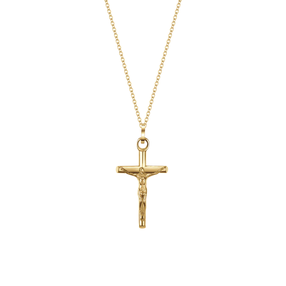 Collana in acciaio IP gold con crocifisso IP gold Lunghezza: 45 + 5 cm Misura crocifisso: 23 x 13 mm. Elegante e ricercata, la collana in acciaio ip gold con piastra crocifisso è l'accessorio ideale per esprimere carattere e stile. Sceglila per un tocco sofisticato e personale.
