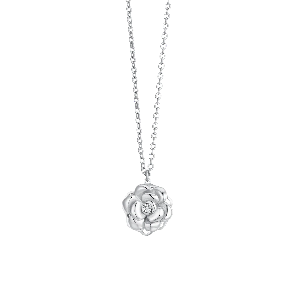 Collana Donna in acciaio con rosa girevole e cristallo bianco. Lunghezza: 40 + 5 cm. Misura rosa: 14 x 4 mm. Misura cristallo: 2,3 mm. La delicata rosa girevole, simbolo di bellezza e femminilità, aggiunge un tocco romantico, mentre il cristallo bianco brillante cattura la luce in modo straordinario. Leggera e resistente, questa collana è ideale per esaltare il tuo stile quotidiano o per rendere speciali le tue serate. Indossala da sola o abbinala ad altri gioielli per un look unico e personale.