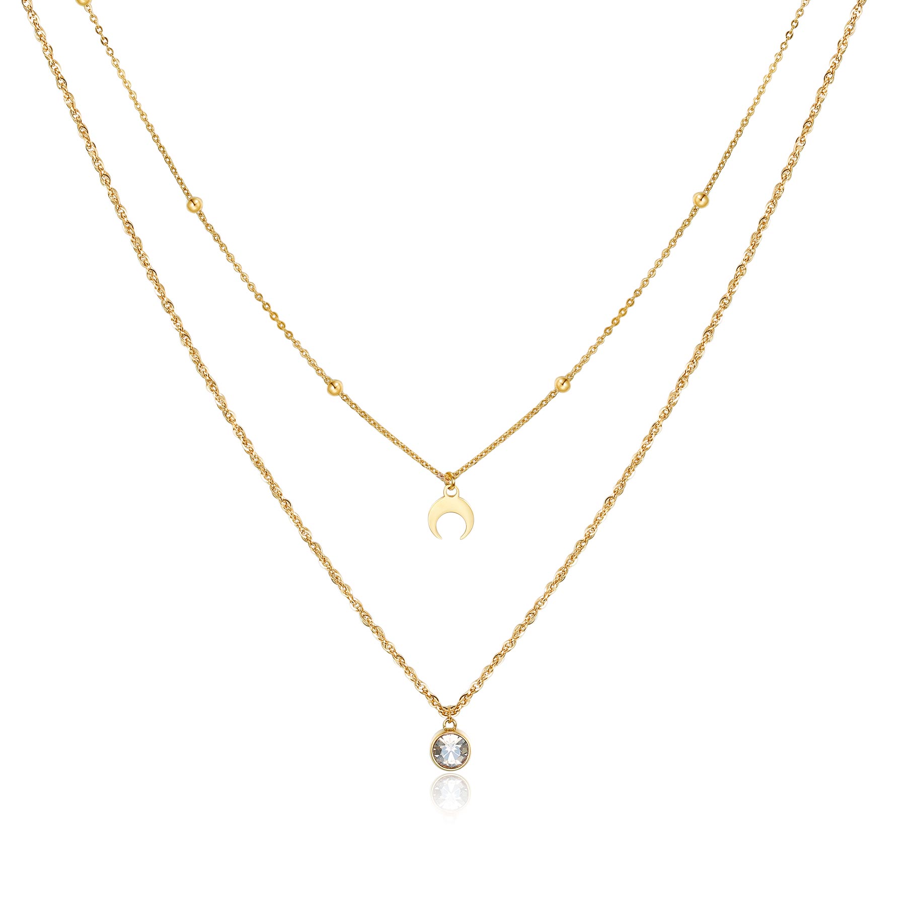 Collana girocollo a doppio filo in acciaio 316L, finitura pvd oro 14K con pendente a forma di luna crescente e cristallo colore crystal honey.
