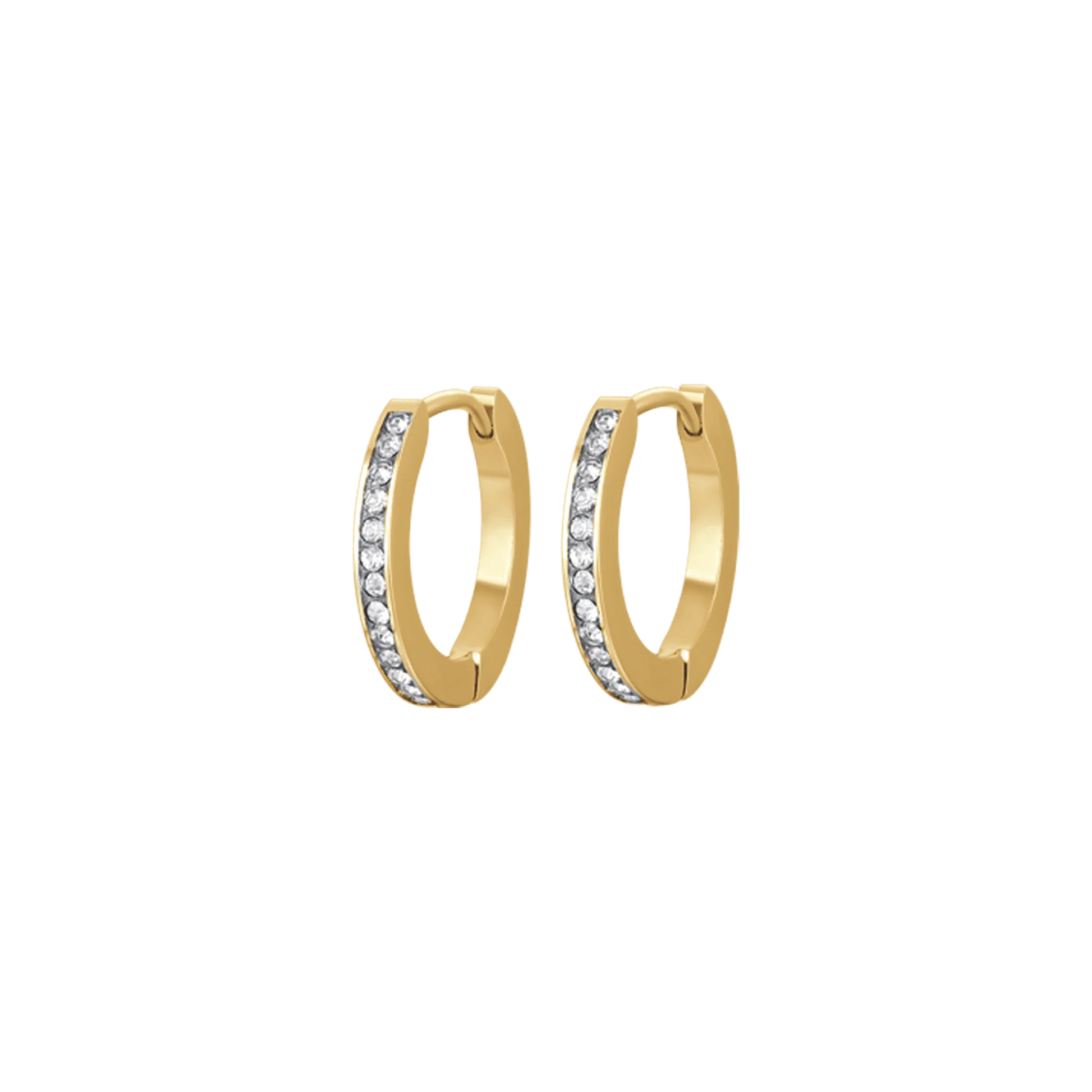 Orecchini donna in acciaio IP gold con cristalli bianchi. Diametro: 18 mm. Gli orecchini da donna in acciaio IP Gold con cristalli bianchi offrono uno stile semplice ed elegante. Illumineranno qualsiasi outfit donando un tocco di lucentezza e raffinatezza. Rendi il tuo look unico con questi orecchini da donna!