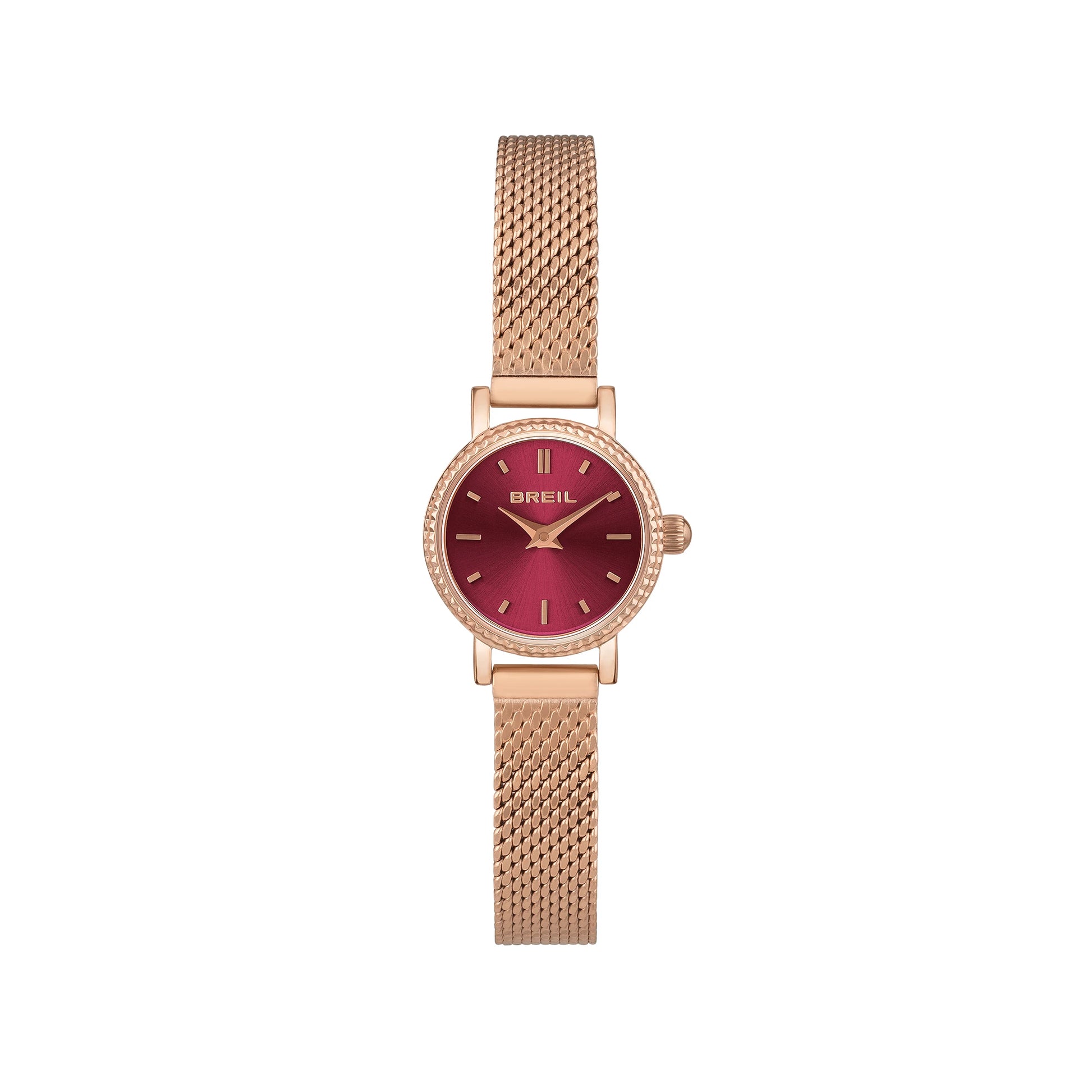 L'orologio da donna Darling è un piccolo gioiellino dal sapore vintage realizzato in acciaio IP rose. La cassa misura solo 18 mm e si ispira ai modelli vintage del passato. Arricchita da una raffinata decorazione sulla lunetta è abbinata a un bracciale sottile e flessuoso in maglia milanese. Il quadrante rosso rubino dà un tocco in più.