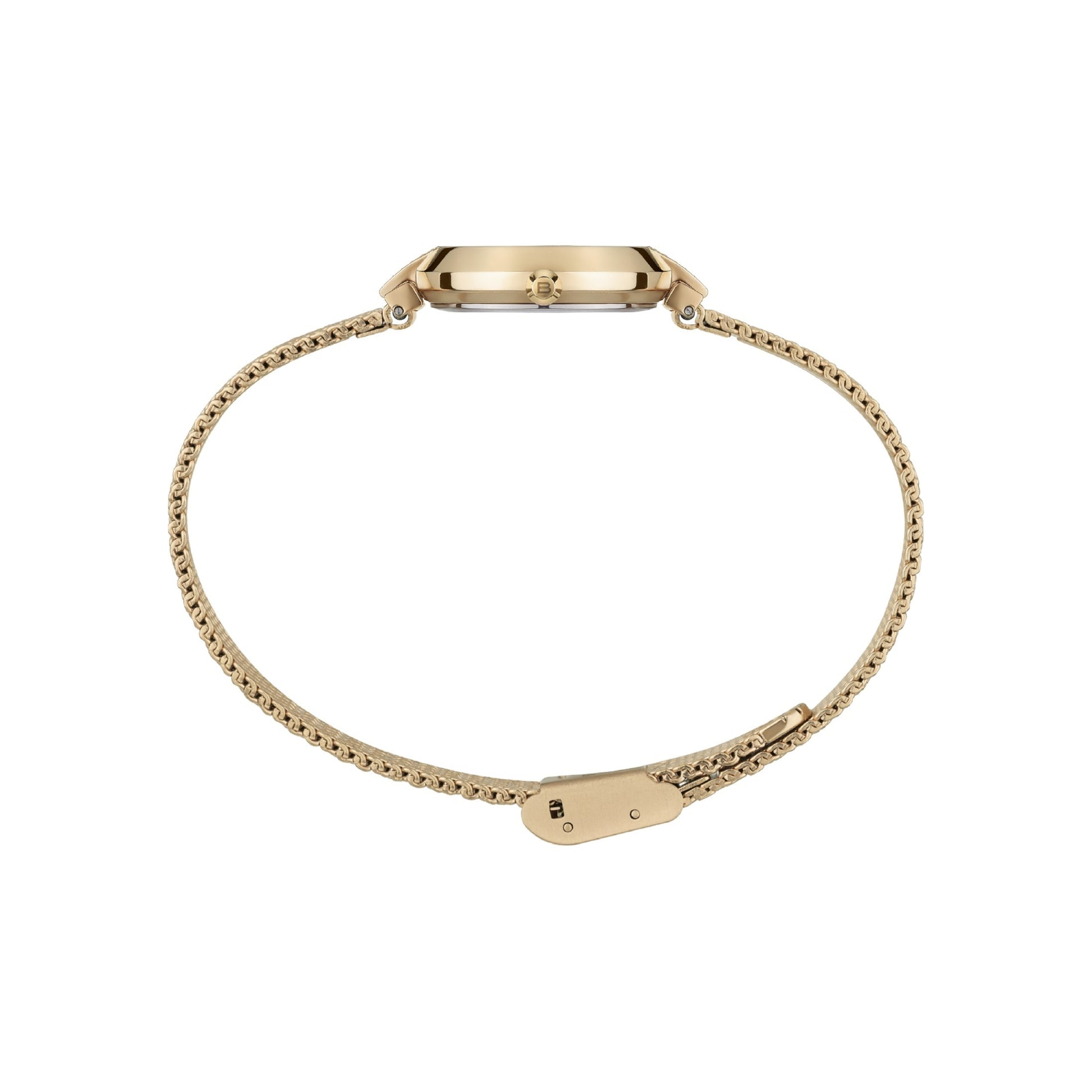 L'orologio da donna Soul in acciaio IP gold è chic e prezioso. La particolare costruzione di cassa, anse e bracciale ne fa un piccolo gioiellino da portare sempre al polso per rendere elegante ogni look. I dettagli lucenti sono dati dai cristalli sulle anse e dalla lavorazione diamantata del bracciale mesh.